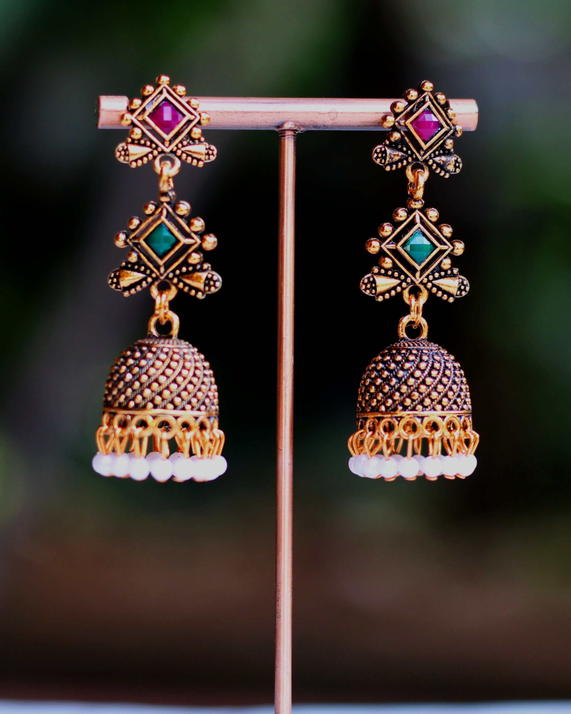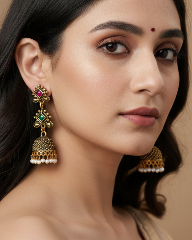 Embrace timeless beauty with our Antique Royale Jhumkas (ER03) from Tangamala Jewellery. These stunning bell-shaped earrings feature a luxurious antique gold-toned finish and intricate detailing on the jhumka bell. The design is elegantly topped with beautiful pink and green stones and finished with a delicate row of small white pearl-like drops, making them a perfect statement piece for any traditional occasion.