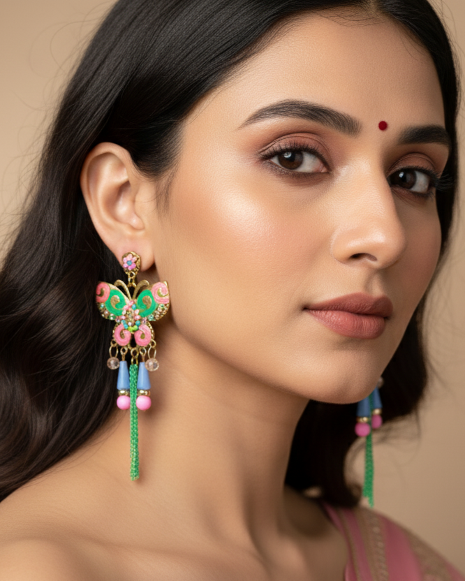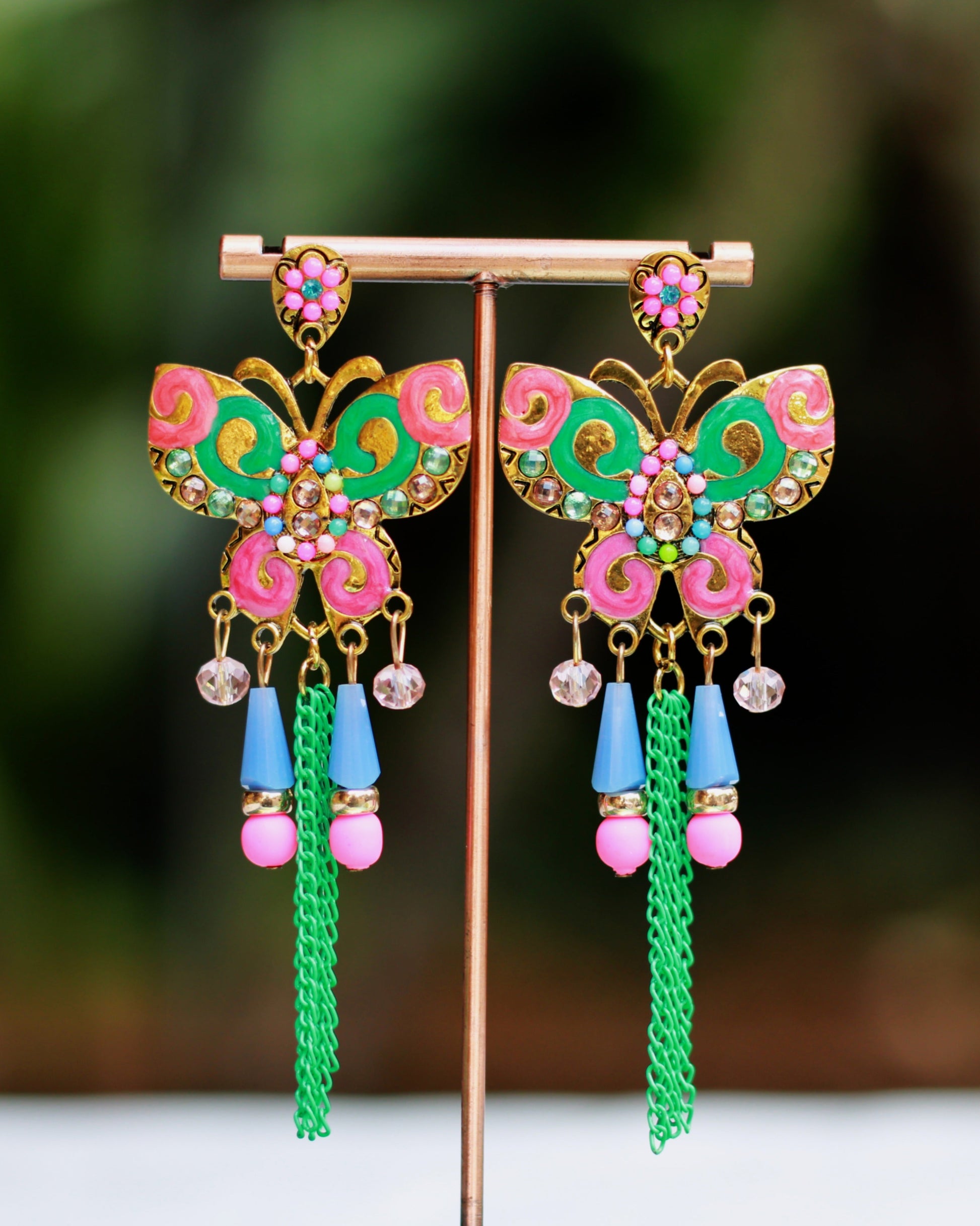Add a pop of color to your style with our Boho Bloom Danglers (ER07) from Tangamala Jewellery. These playful earrings feature a beautiful butterfly-shaped design with vibrant pink and green enamel work. The whimsical style is complete with dangling chains and colorful blue and pink beads, making them a fun and eye-catching accessory for any bohemian-inspired look.