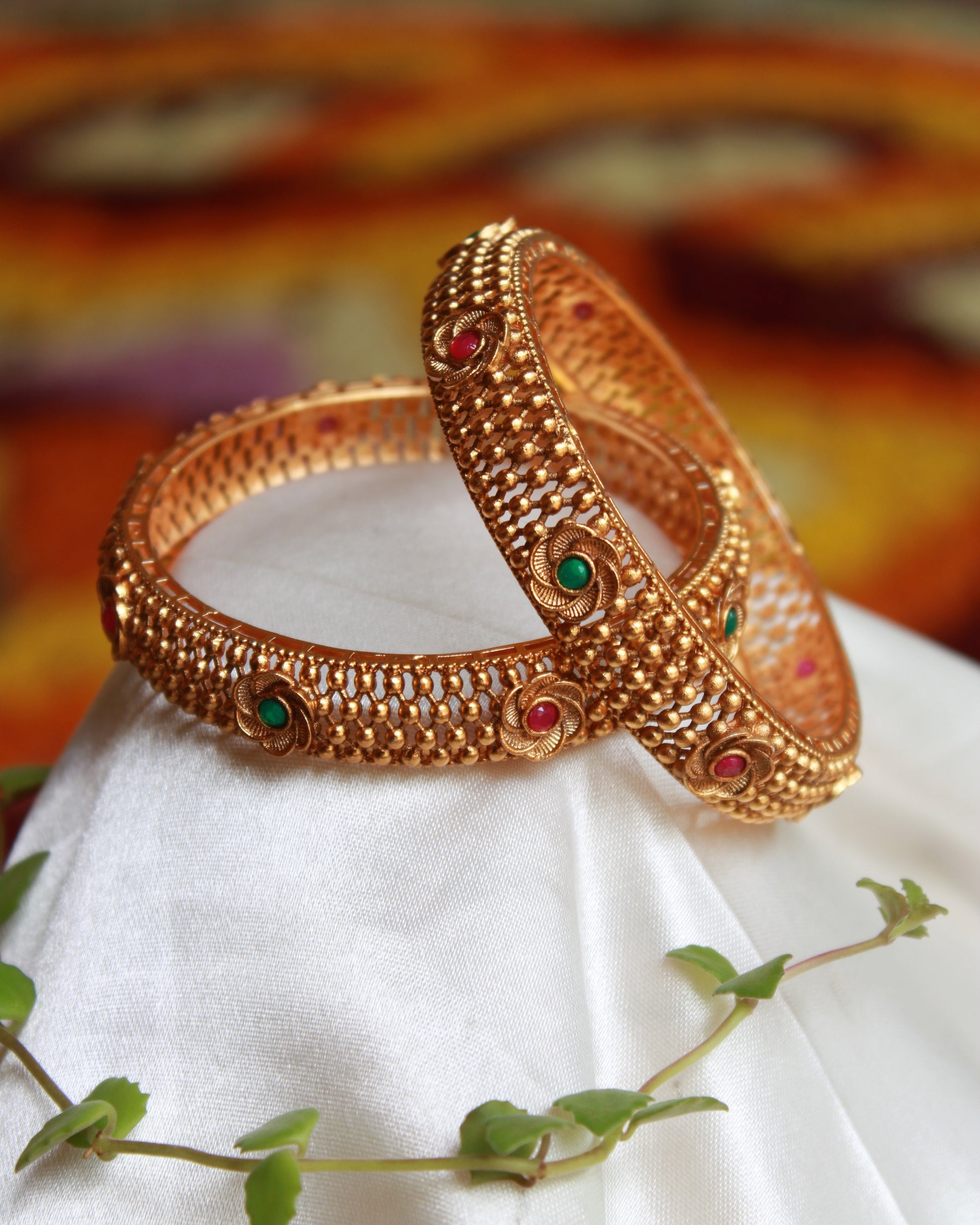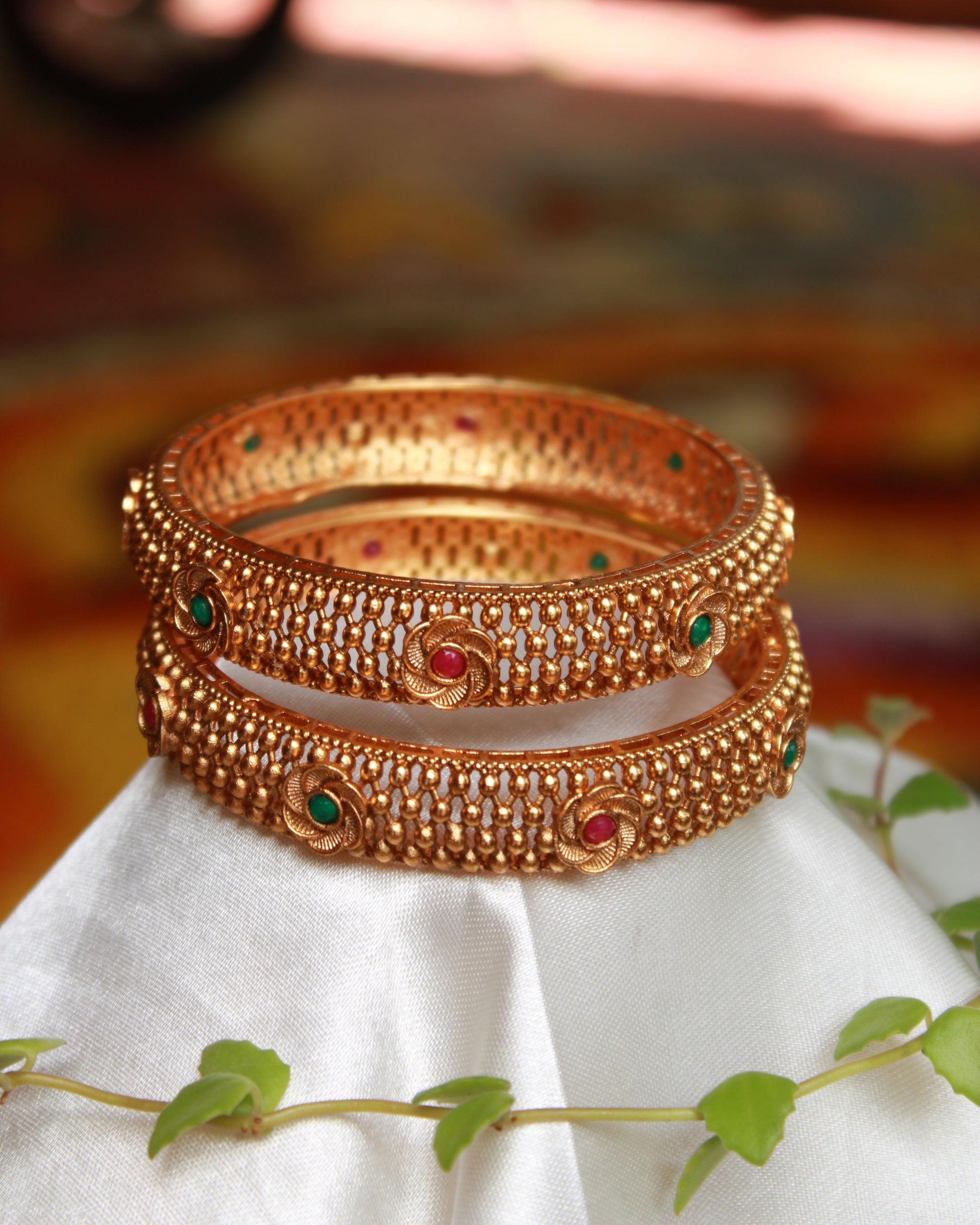 Discover the traditional charm of our Chakra Kada Bangles 2pcs (BN04) from Tangamala Jewellery. This pair features a classic "kada" style, with a bold, intricate design of circular (chakra) motifs. The bangles are beautifully accented with vibrant red and green stones, creating a rich and elegant look that is perfect for any festive or special occasion.