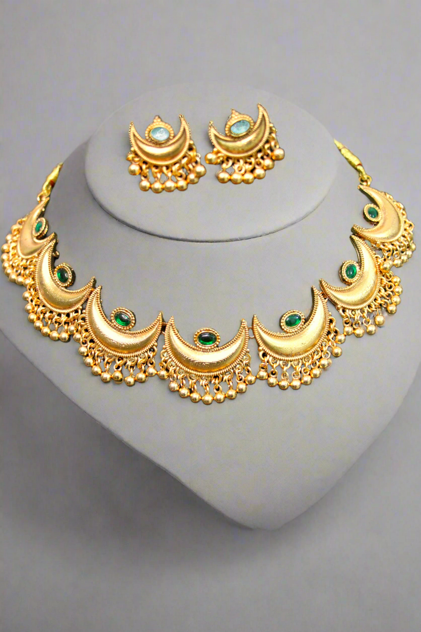 Discover the timeless charm of our Chandrakor Necklace Set. This beautiful traditional choker is a tribute to celestial design, featuring a series of intricate crescent-shaped motifs (Chandrakor) adorned with vibrant green stones and delicate golden beads. The set comes with matching earrings, making it a perfect statement piece for festive celebrations, weddings, or any occasion that calls for a touch of classic elegance.