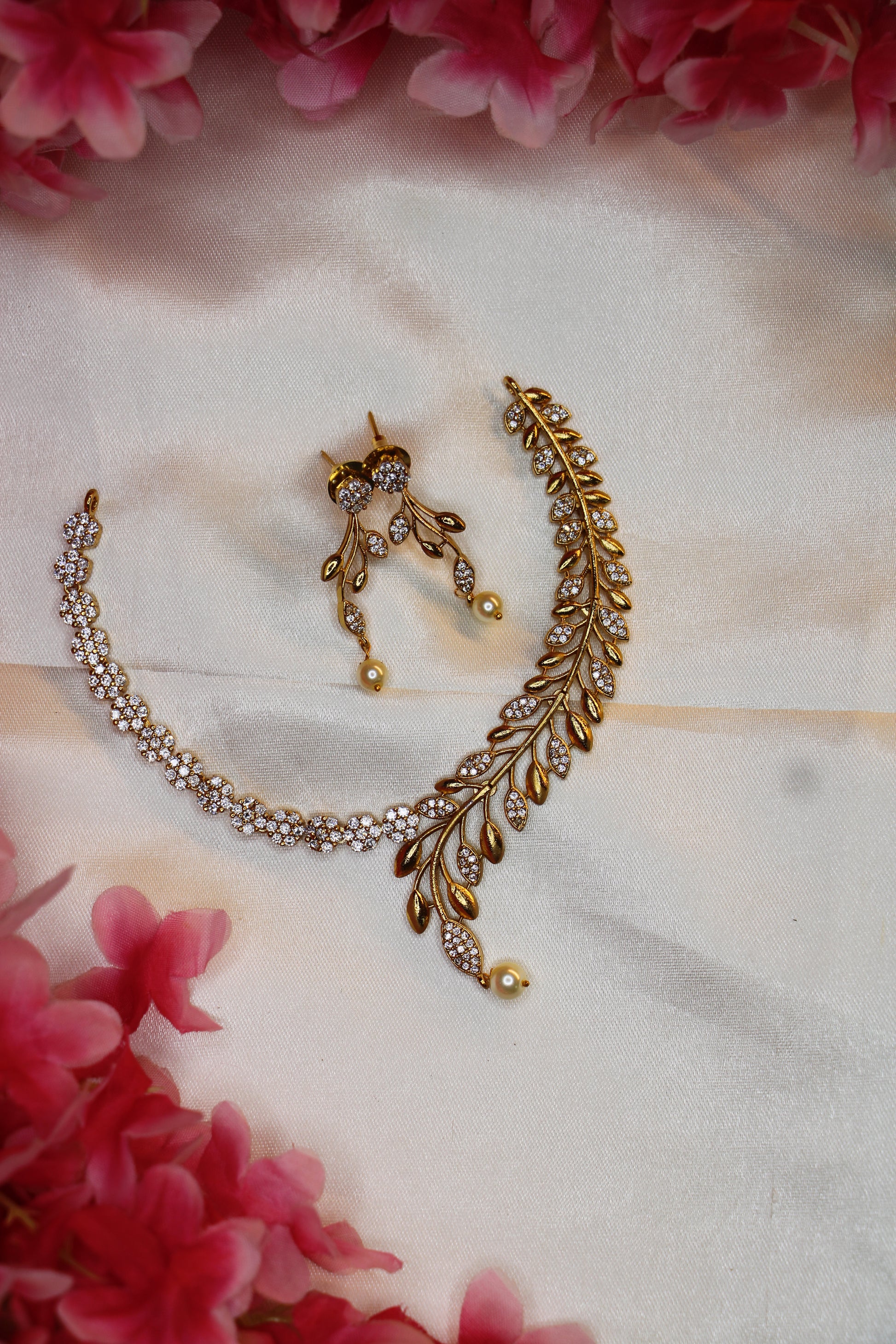 Discover a blend of modern and traditional style with our CZ Matte Finish AD Stone Necklace (NK22) from Tangamala Jewellery. This elegant piece features a unique asymmetrical design with one side showcasing a line of sparkling clear stones and the other a beautifully detailed leaf motif. Finished in a rich antique matte gold, the set is completed with matching earrings and a single pearl drop, making it a perfect accessory for any occasion.