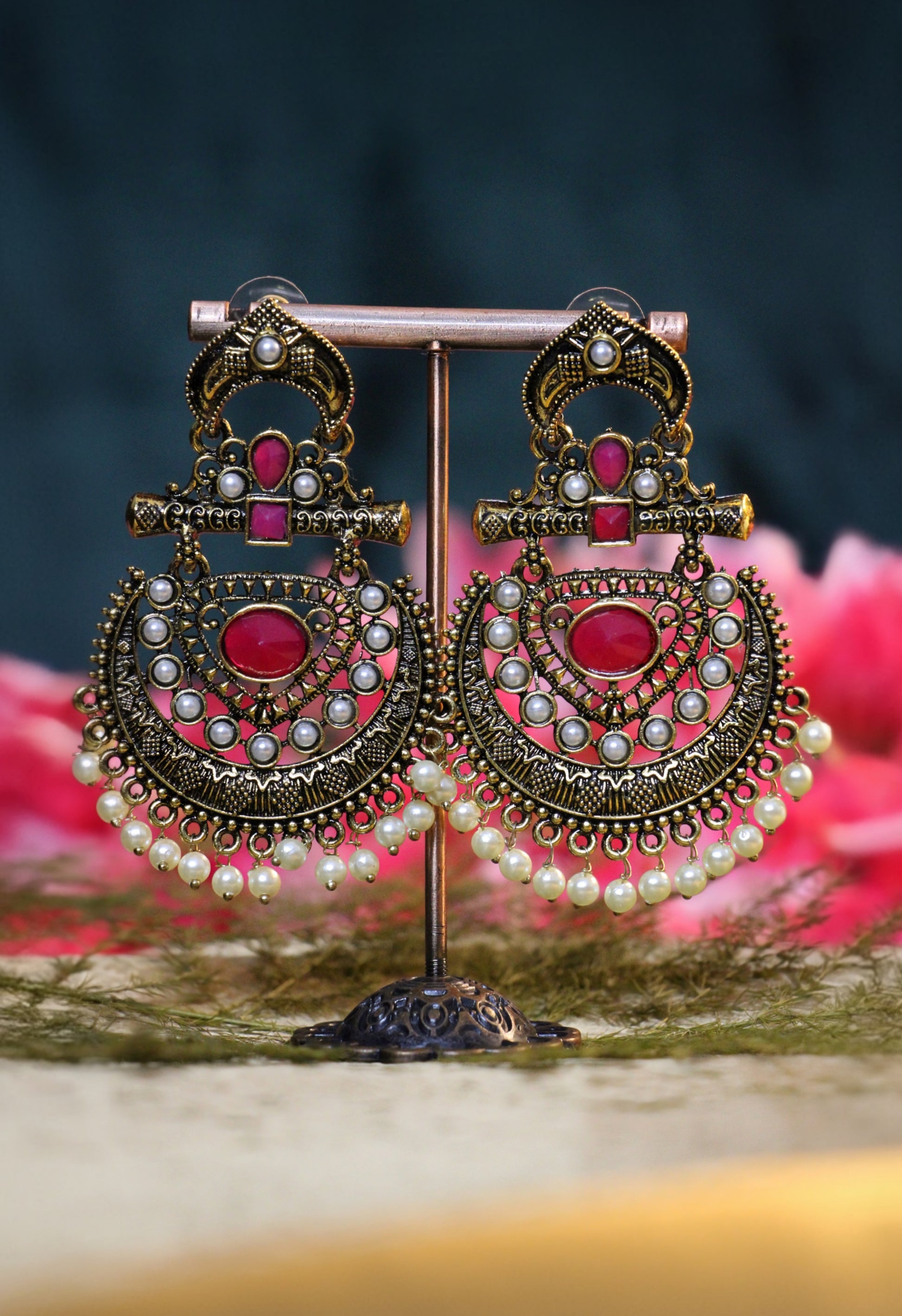 Discover the grandeur of our Gold Oxidized Chandbali Earrings (OX06) from Tangamala Jewellery. These stunning statement earrings feature a classic crescent-moon shape with an intricate, antique-gold-toned oxidized finish. The elegant design is further enhanced by a central blue stone and delicate pearl drops, making them a perfect blend of traditional and modern bohemian styles.