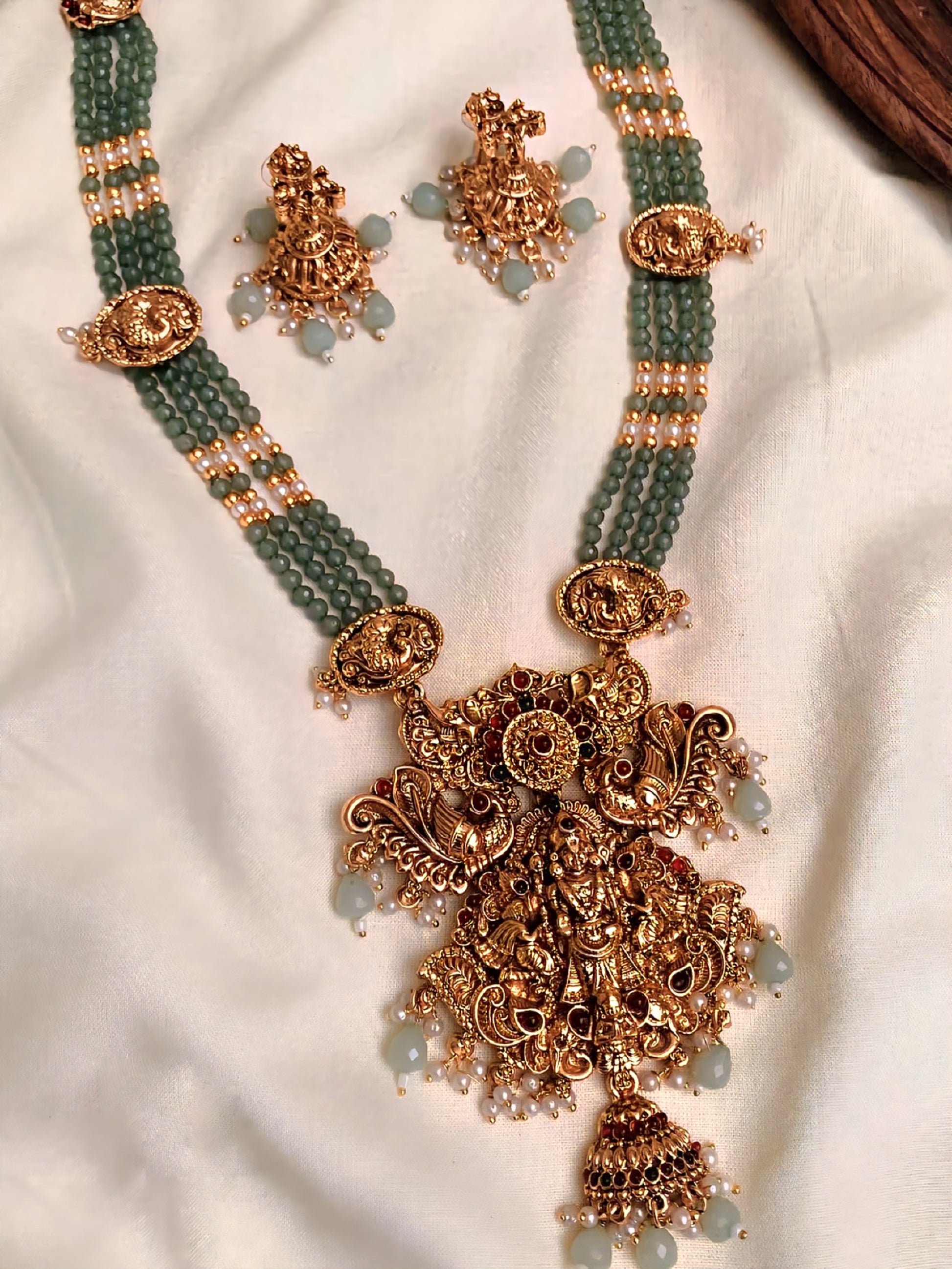 Discover timeless elegance with our Lakshmi Pendant Pearl Haram (LH04) from Tangamala Jewellery. This stunning piece features a detailed Lakshmi pendant, beautifully surrounded by a multi-layered arrangement of green beads and pearls. The necklace, which rests gracefully around the neck in a shorter haram style, is a perfect blend of traditional design and rich craftsmanship, making it an ideal choice for any festive occasion.