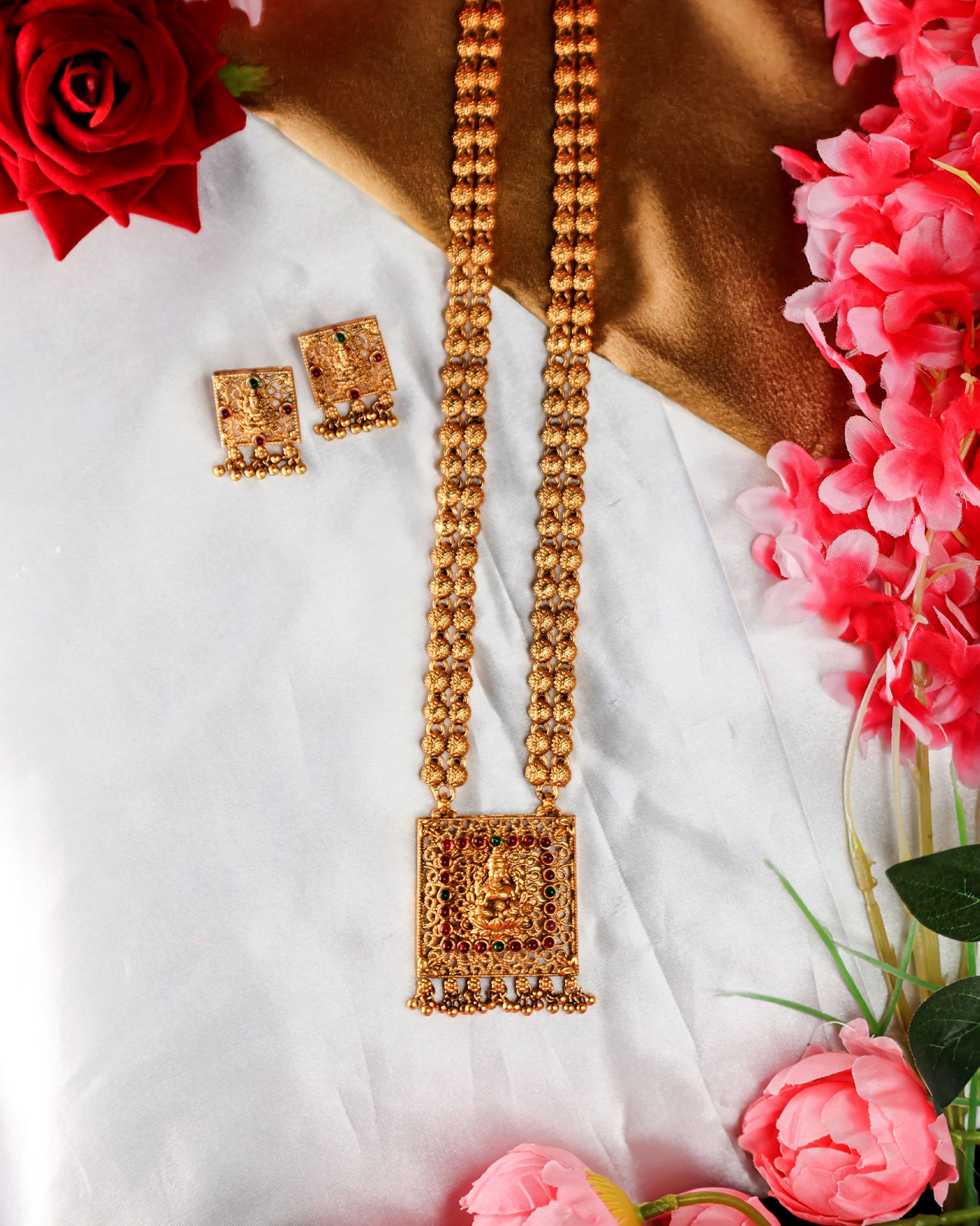 Discover traditional grandeur with our Lakshmi Square Pendant Haram (LH09) from Tangamala Jewellery. This magnificent long necklace features a double strand of classic golden beads, leading to a prominent square-shaped pendant. The centerpiece showcases a beautifully detailed figure of Goddess Lakshmi, adorned with vibrant ruby and green stones, making it a perfect statement piece for any special occasion.