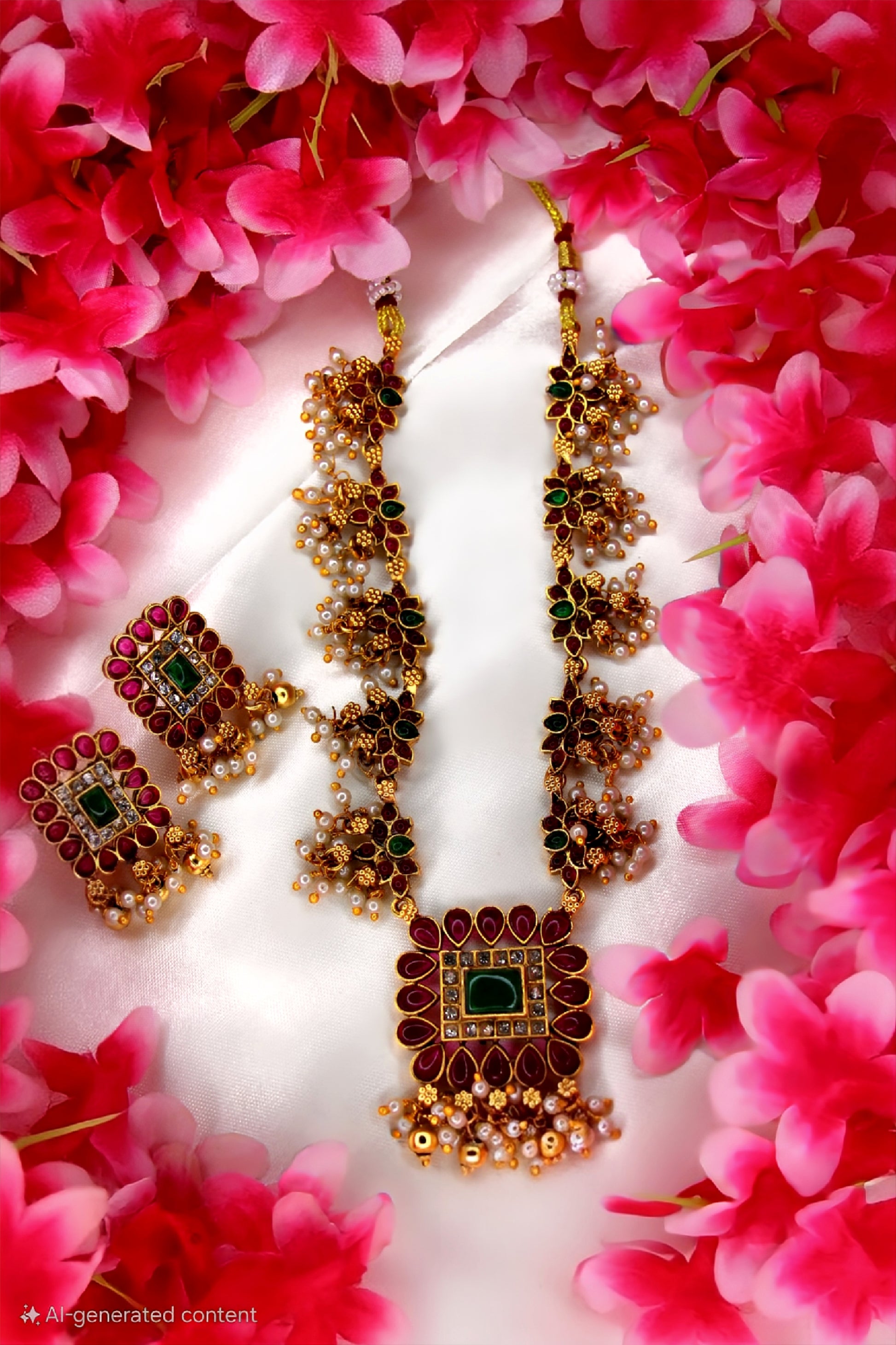 Discover a timeless design with our exquisite Lotus Multicolor Faux Gemstone Necklace (NK4). This traditional set features a beautifully crafted square pendant with a central green stone, bordered by vibrant red stones and delicate pearls. The necklace chain is adorned with small, intricate lotus-like motifs with multicoloured accents, making it a perfect statement piece for festive celebrations and traditional occasions.