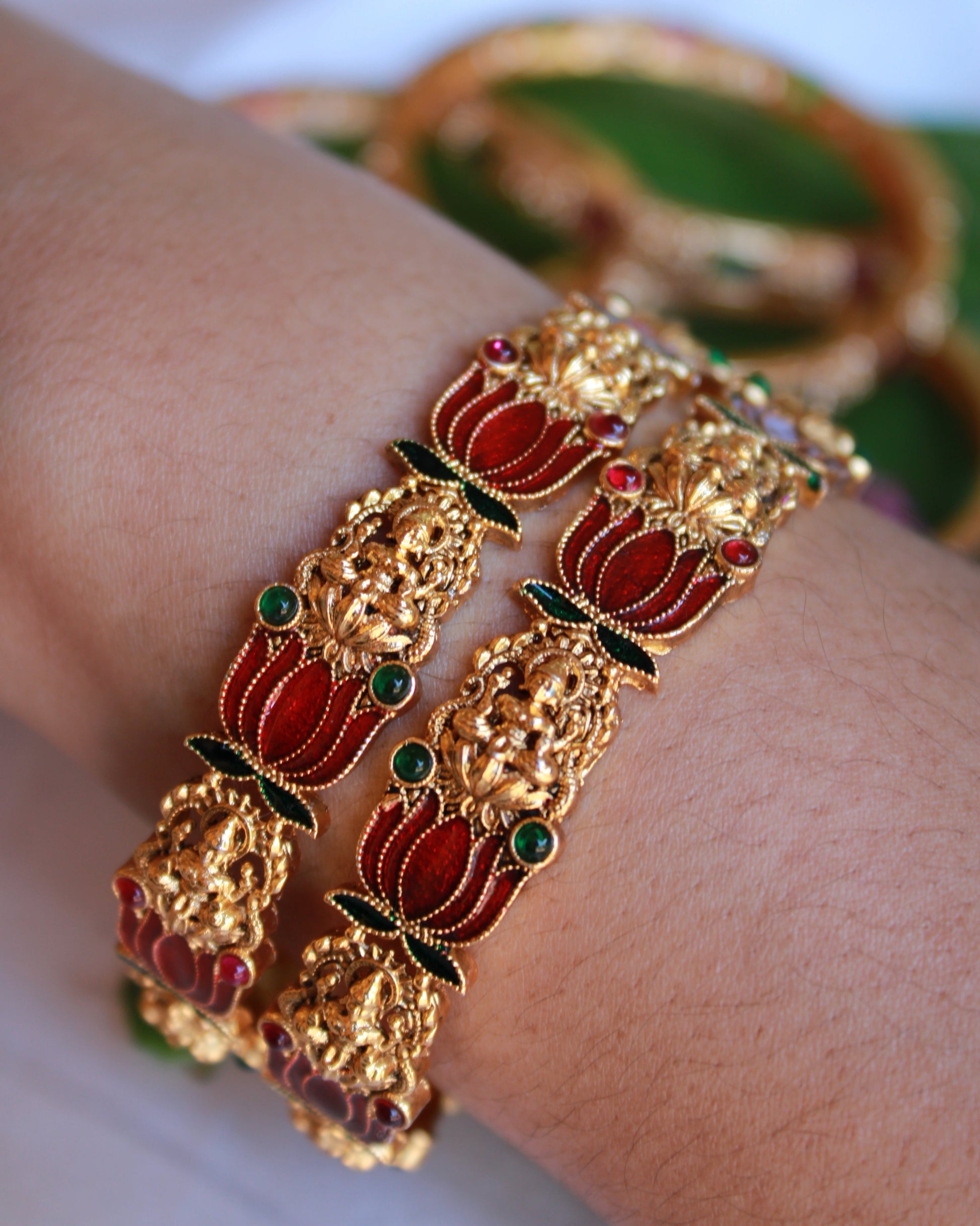 Discover divine beauty with our Lotus with Lekshmi design Bangles (BN11) from Tangamala Jewellery. This elegant pair features a unique, intricate design with alternating figures of the Goddess Lakshmi and stunning lotus motifs. The bangles are highlighted with vibrant green and red enamel and a scalloped edge, making them a beautiful blend of spiritual symbolism and traditional artistry.