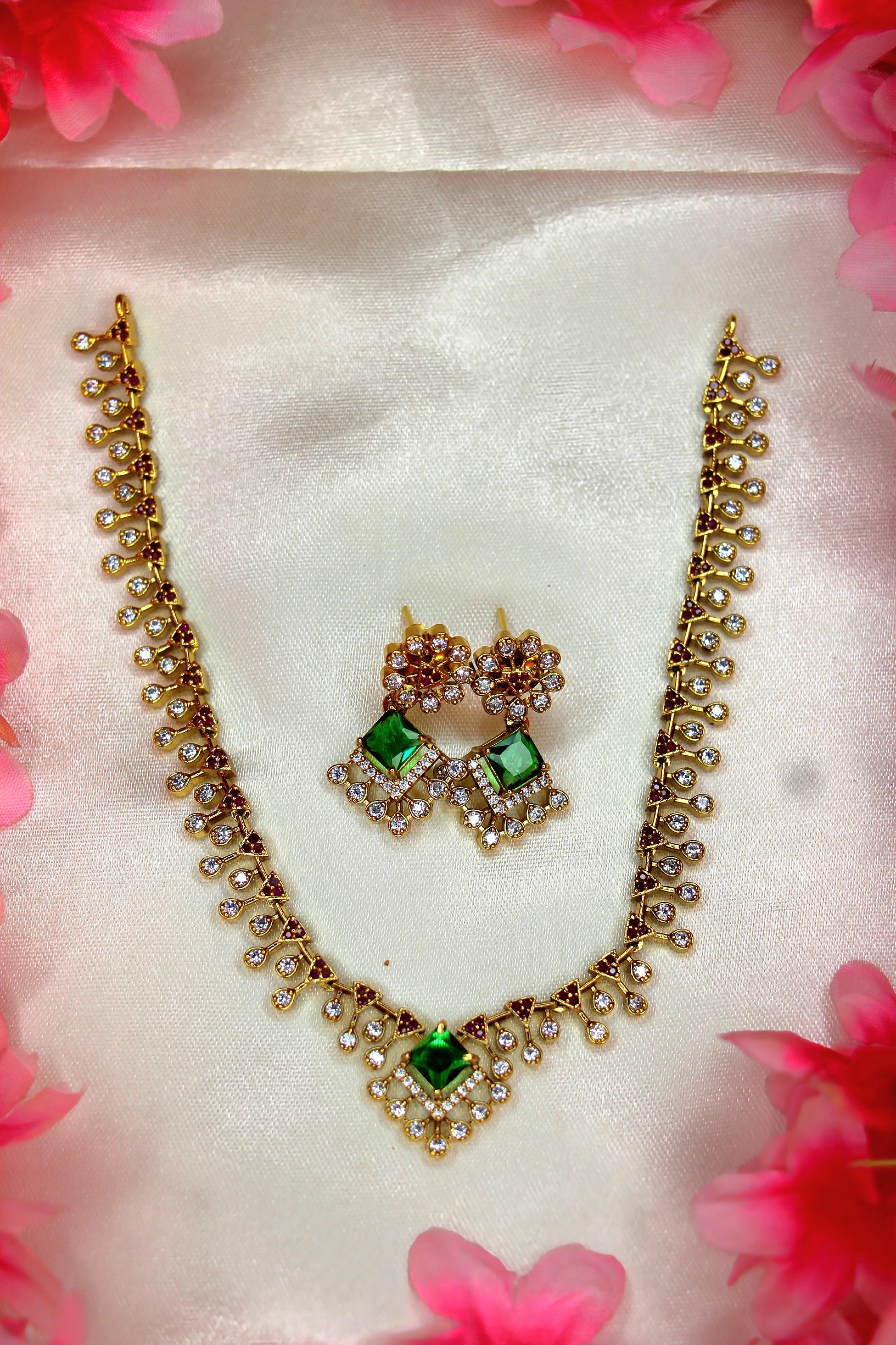 Discover classic charm with our Matte Finish AD Stone Necklace with Studs (NK21) from Tangamala Jewellery. This elegant necklace features a beautiful V-shaped design, with the chain intricately detailed with sparkling AD (American Diamond) stones. The centerpiece is a stunning square pendant with a prominent green stone and surrounding clear stones, all finished in a rich antique matte gold. The set includes matching earrings, making it a perfect blend of sophistication and traditional style.