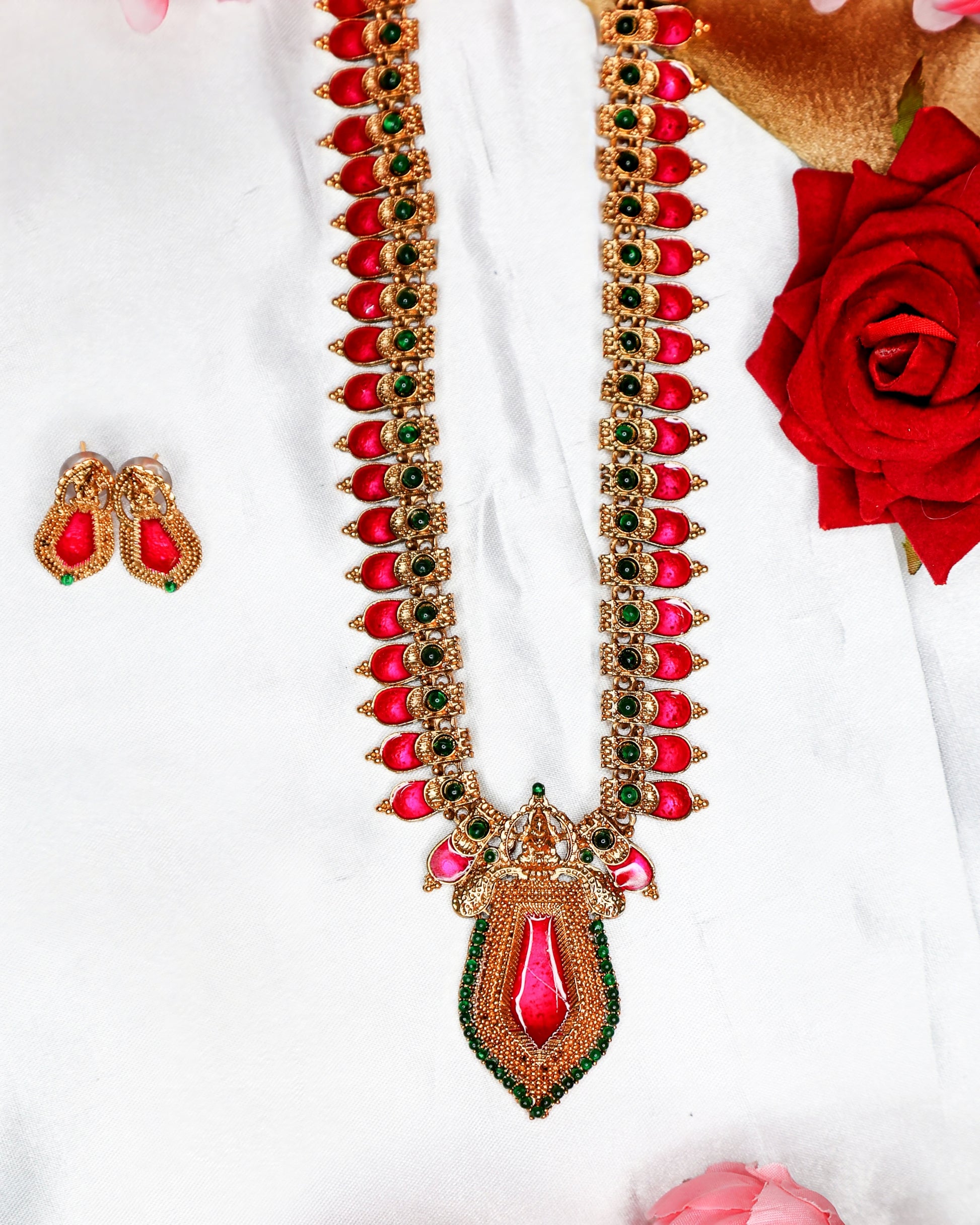 Discover the traditional charm of our Palakka Haram (LH10) from Tangamala Jewellery. This magnificent long necklace features a classic leaf-like (palakka) design, with each motif adorned with vibrant green and ruby-red stones. The necklace includes a beautiful central pendant with a large green stone, making it a perfect statement piece that honors rich heritage and sophisticated style.
