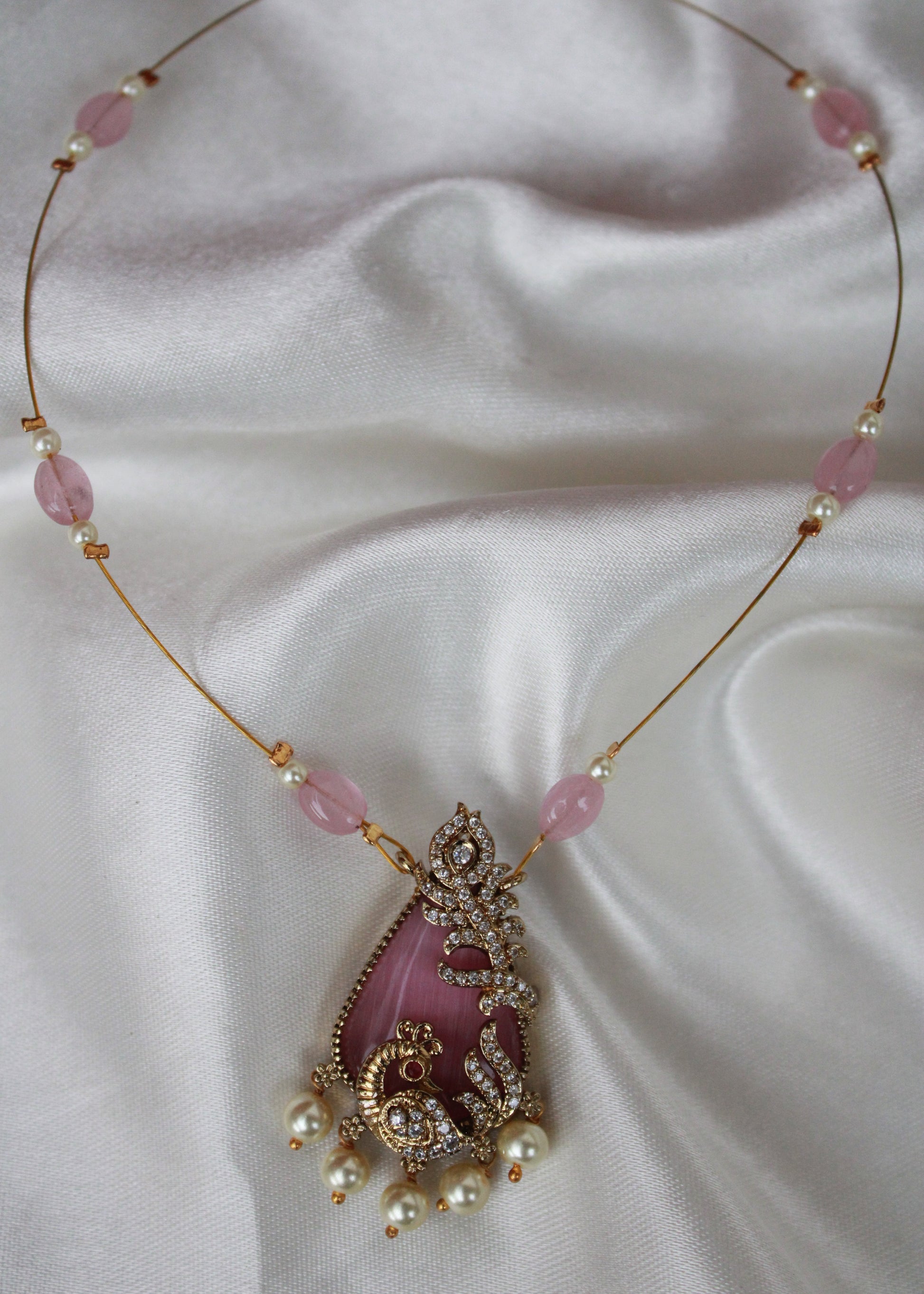 Make a subtle yet striking statement with our Peacock Invisible Chain Necklace (IC05) from Tangamala Jewellery. This elegant piece features a dainty, thin-wire invisible chain that makes the pendant appear to float effortlessly. The pendant is a stunning teardrop-shaped dark green stone, crowned with a delicately AD-studded peacock motif and finished with shimmering pearl drops.