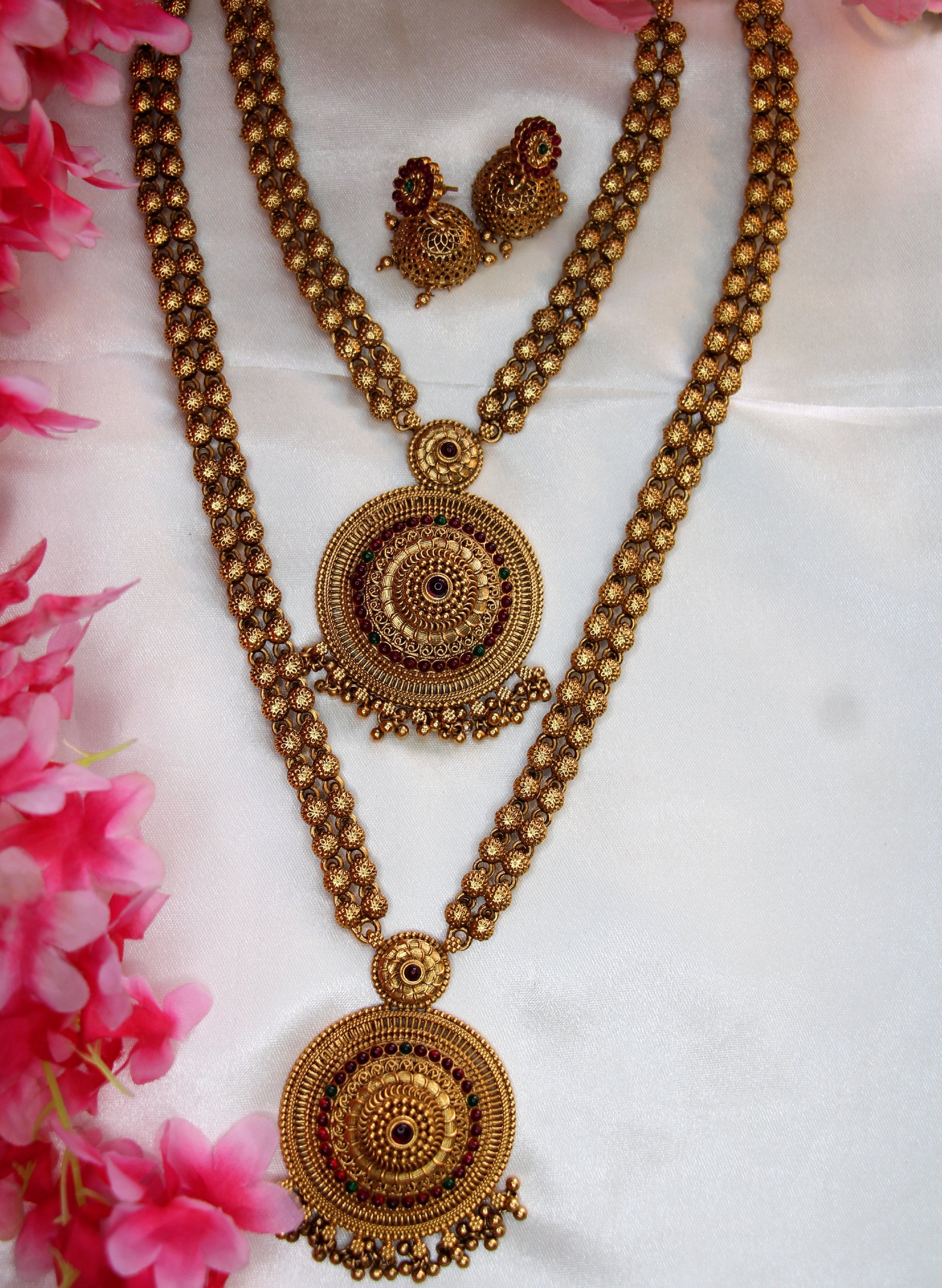 Feel like royalty on your wedding day with our exquisite Rani Haram Bridal Set. This stunning traditional jewellery set features a beautifully crafted, multi-layered long haram, a shorter necklace, and matching earrings. With its intricate temple-inspired motifs, rich antique finish, and vibrant stone accents, this set is the perfect statement piece for a truly grand and memorable bridal look.