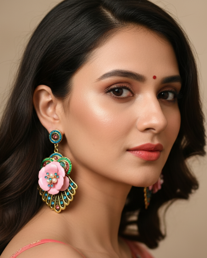 Make a grand statement with our Royal Blossom Wings Earrings (ER09) from Tangamala Jewellery. These elaborate, wing-shaped earrings are a masterpiece of intricate design, featuring a prominent pink floral blossom at the center. The design is beautifully adorned with shimmering blue, green, and pink stones, and detailed with delicate pearls, making them a truly regal accessory for any special occasion.