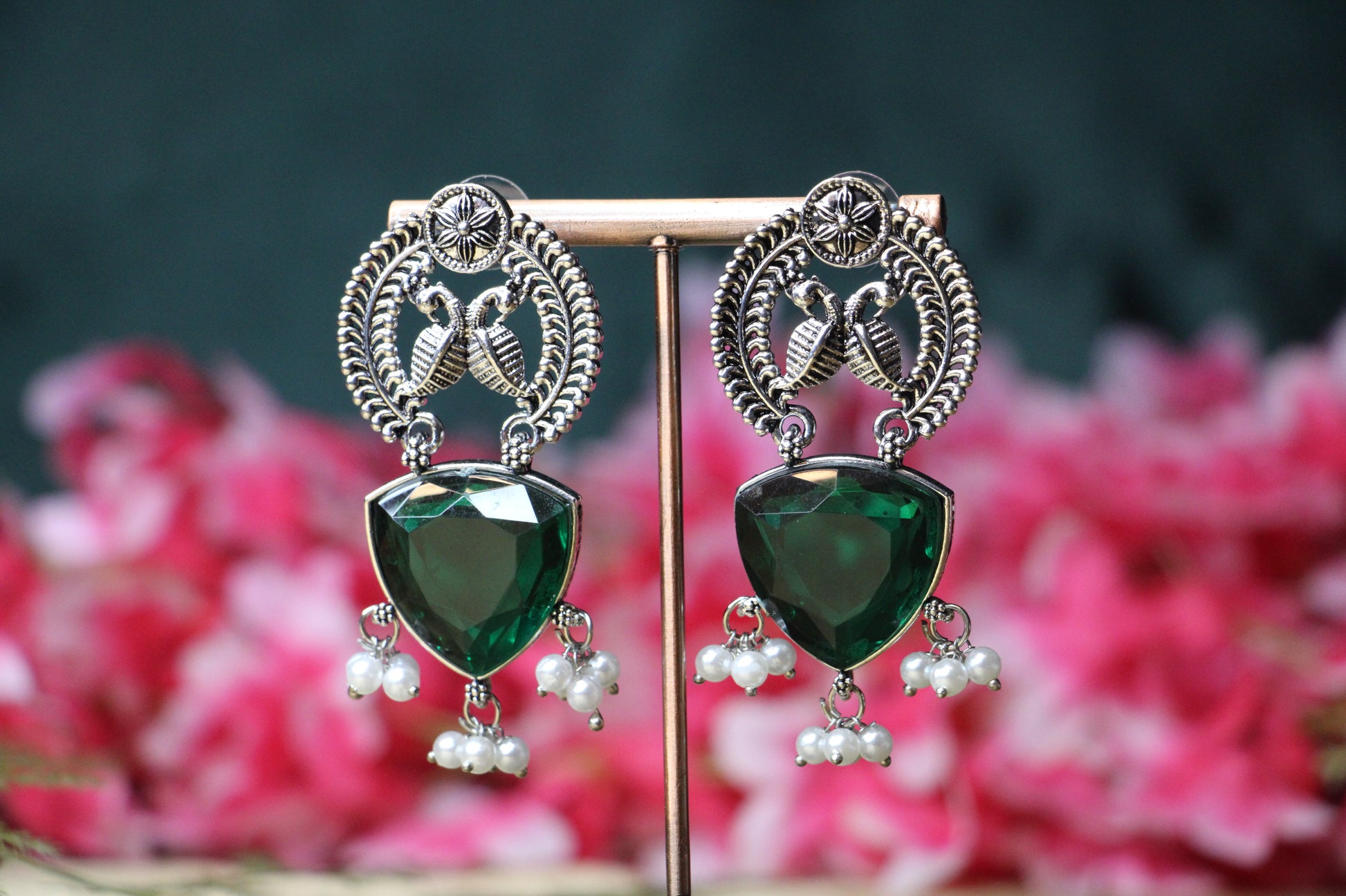 Discover the timeless artistry of our Silver Peacock Jhumka Earrings (OX11) from Tangamala. These stunning earrings feature a striking oxidized silver finish and a detailed peacock motif. The elegant design is completed with a large, faceted green stone and delicate pearl drops, creating a beautiful and unique statement piece.