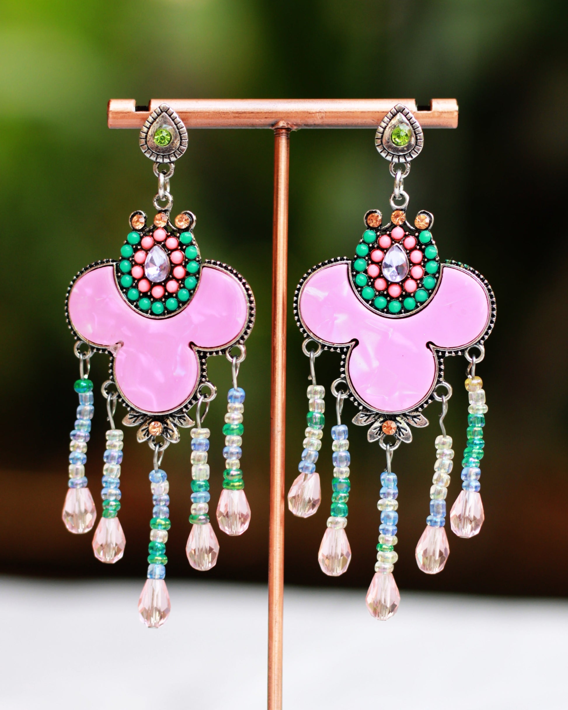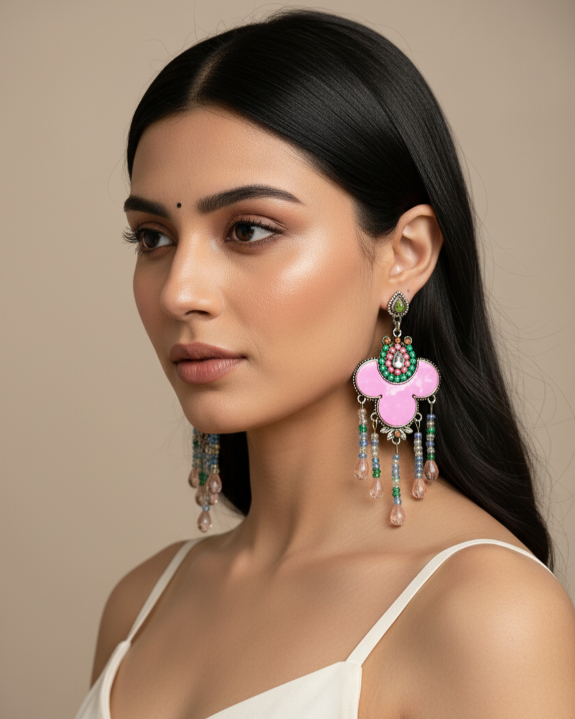 Add a touch of vibrant, festive energy to your look with our Tribal Fiesta Danglers (ER10) from Tangamala Jewellery. These unique earrings feature a bold pink enamel motif, framed by intricate patterns and colorful beads. The design is beautifully finished with a cascade of beaded danglers, making them a perfect statement piece for celebrations and bohemian-inspired styles.